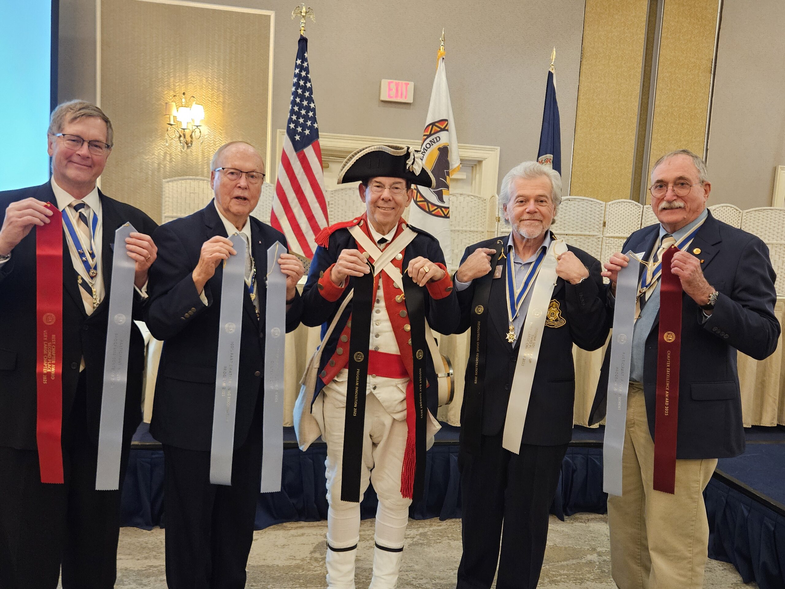 The Williamsburg Chapter SAR was well represented during the awards ceremony of the Virginia Society SAR annual meeting held on Feb. 7, 2026. From left to right, Past Chapter President John Lynch, Chapter Vice President Ray Duncombe, Chapter President Ron Adolphi, Gary Dunaway and Bruce Laubach.